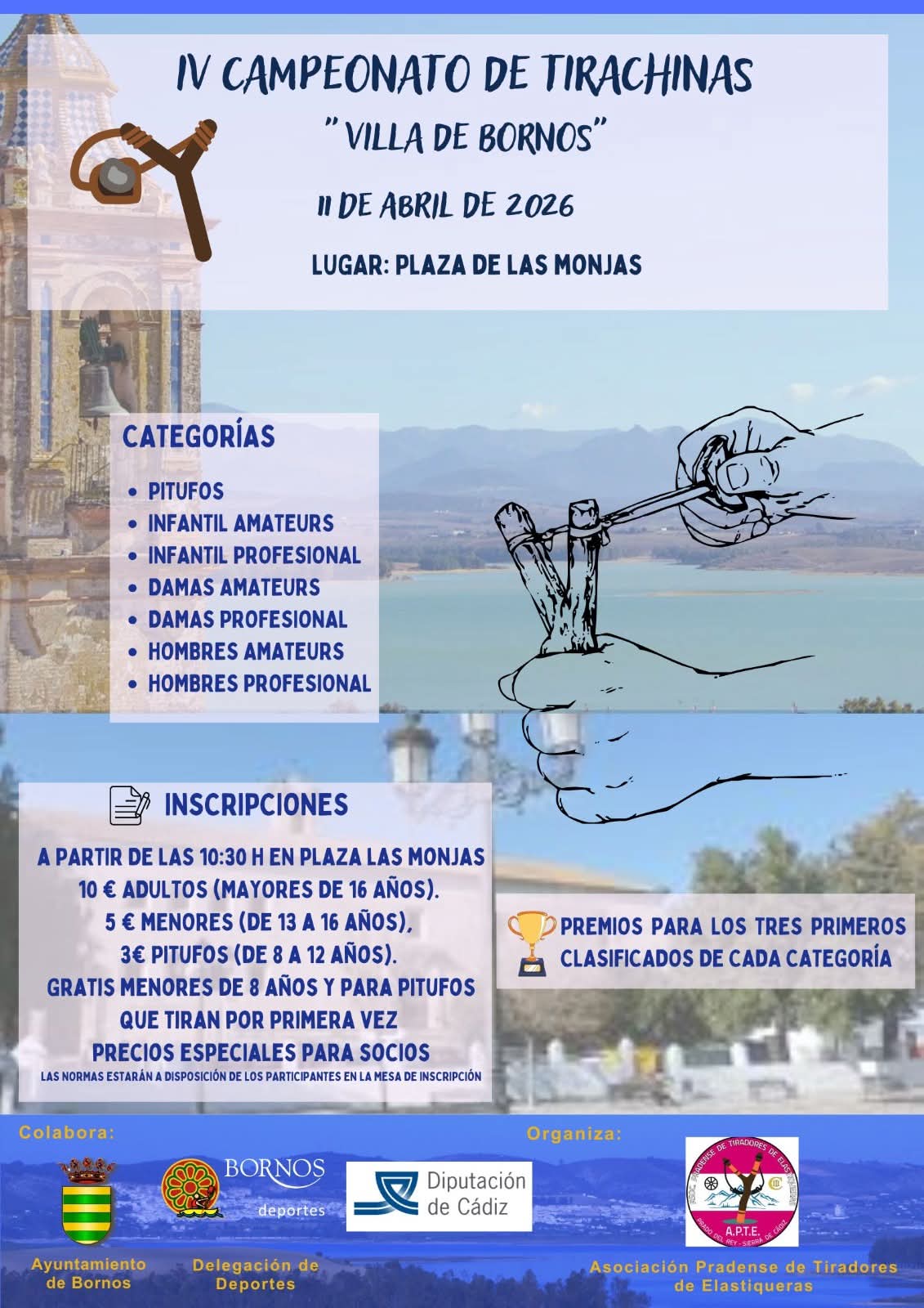El sΓ‘bado ππ ππ πππ«π’π₯ tendrΓ‘ lugar en la plaza de las Monjas de #Bornos el IV CAMPEONATO DE TIRACHINAS TRADICIONAL βVILLA DE BORNOSβ organizado por la AsociaciΓ³n Pradense de Tiradores de Elastiqueras en colaboraciΓ³n con la DelegaciΓ³n de Deportes del Ayuntamiento de Bornos.