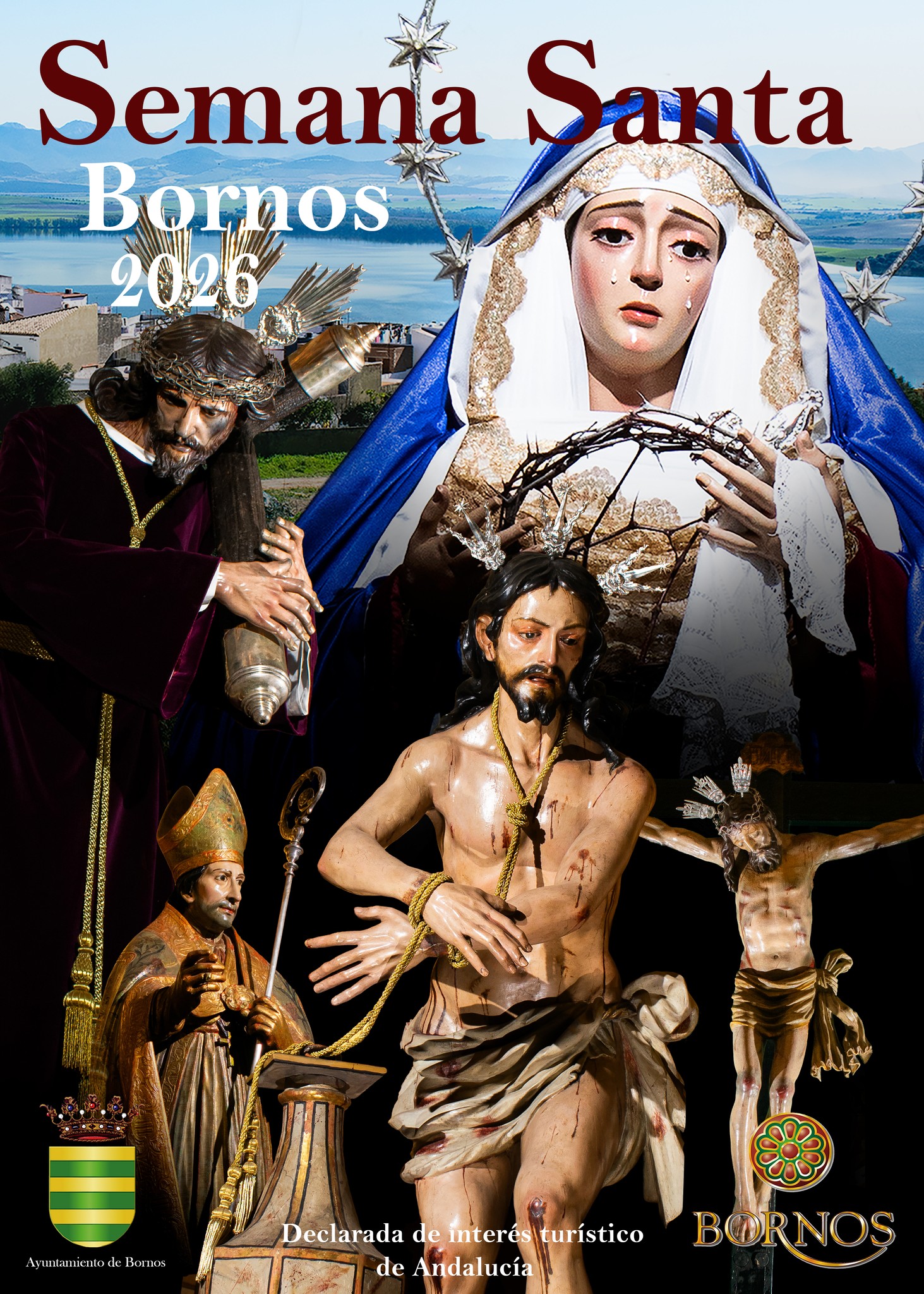 El cartel reúne a Cristos titulares de algunas hermandades de Bornos, junto a la Virgen de la Soledad de la Hermandad del Santo Entierro y el patrón de la localidad, San Laureano, componiendo una escena que representa la devoción, la tradición y el sentir cofrade del municipio.