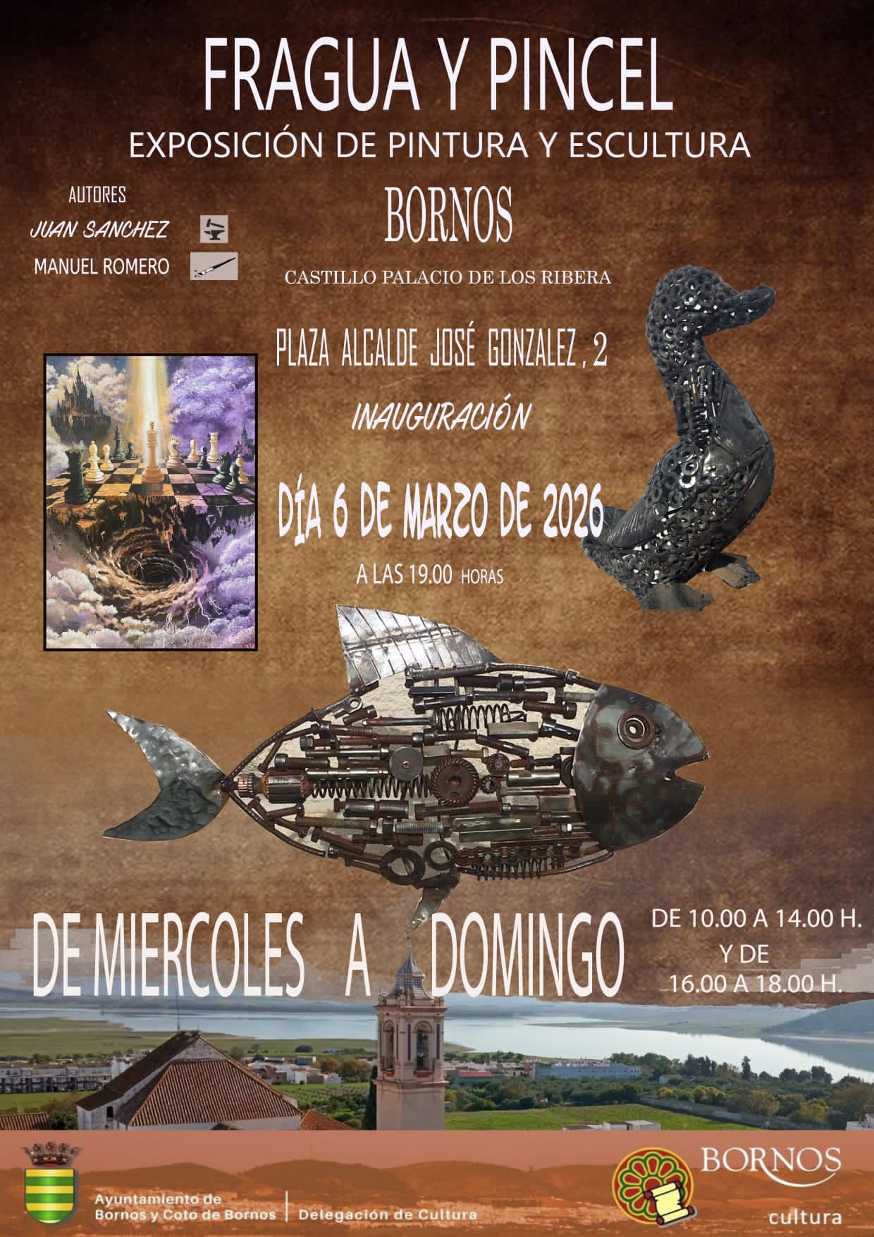 En este caso se trata de una exposición de pintura y escultura titulada "Fragua y pincel", con obras de Juan Sánchez (escultura) y Manuel Romero (pintura).